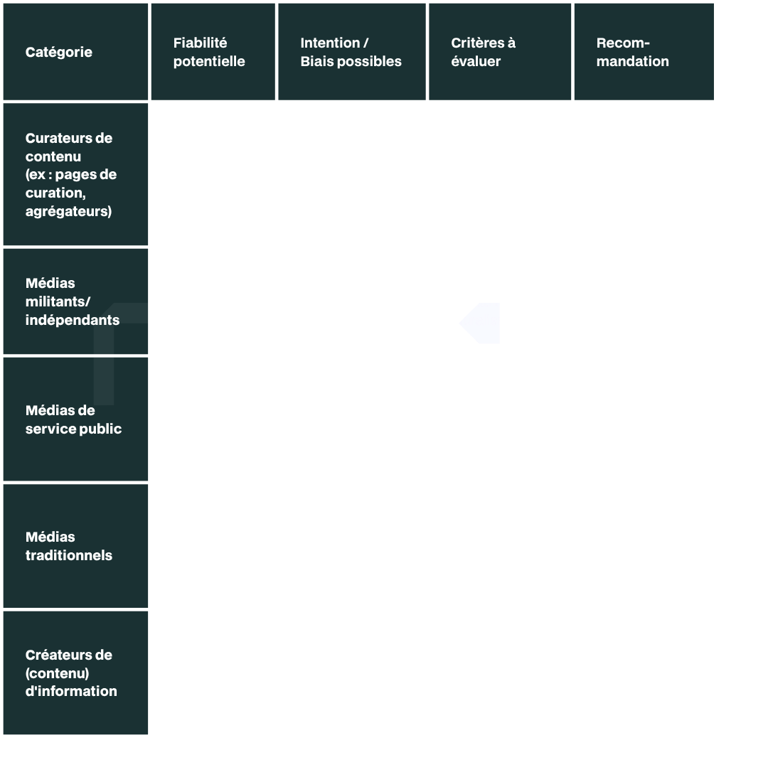 Voici une grille des principaux types d’acteurs de l’information aujourd’hui. Chacun répond à des logiques spécifiques, influence différemment notre attention, notre mémoire et notre jugement.